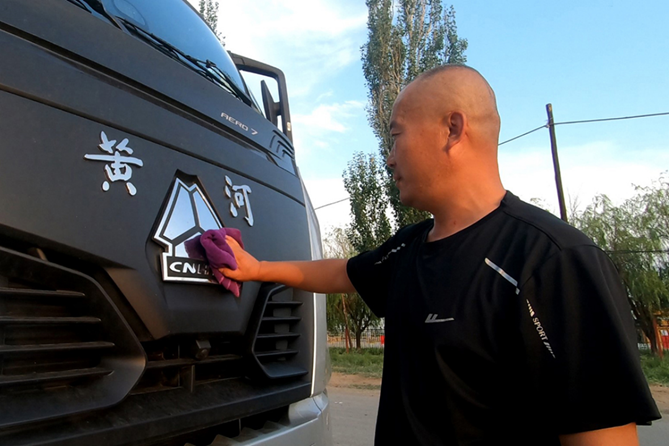 下午14:00,用了整整一個小時的時間洗好車,曾超開著黃河重卡到附近的一家汽車裝潢店門口停下,他需要為這輛剛買不到一個月的車輛貼膜。
