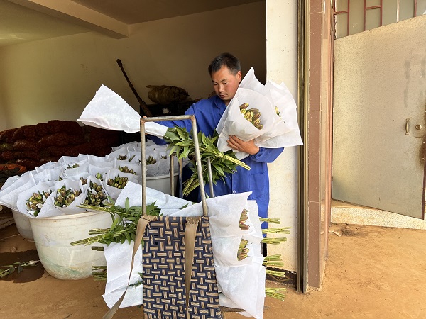 在施挎所的花場,滿園的百合花含苞待放,長勢喜人,記者見到施挎所時,他與妻子二人正忙著采摘、挑貨、打包、裝車……每年10月,都是鮮花銷售的高峰期。這時的他,每天都忙于向昆明花卉市場運送新鮮花卉。據(jù)施挎所介紹,所種植的百合是分批種植的,好處在于能夠延長收割時間,可以確?;ɑ艿男迈r度?!拔覀兯诘奈恢玫靥幐呱剑话闶菑拿磕?月開始分批種植,那時的天氣比較適宜種植百合。一直持續(xù)到10月下旬,天氣轉(zhuǎn)涼,我們就開始休假了?!?/span>