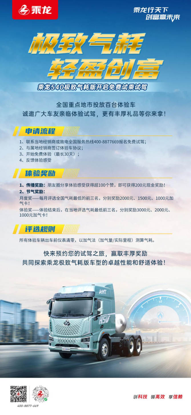 目前,乘龍540極致氣耗版免費試駕活動正如火如荼的進行中,想體驗的卡友可以聯系乘龍當地經銷商或致電全國服務熱線400-8877669報名免費試駕。機會難得,不容錯過!快來參加乘龍540極致氣耗版免費試駕活動吧!一起體驗燃氣車高效節能新時代!