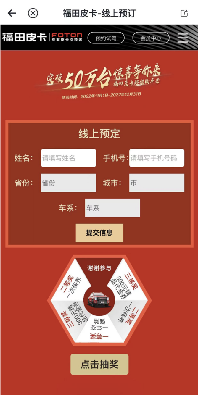 福田皮卡突破50萬臺超值購車季,超多重磅福利大回饋,即日起在線訂車即可享受驚喜好禮,下載APP即刻體驗吧!