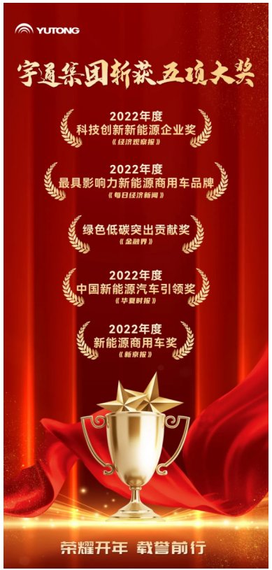 2023年1月11日,由《新京報(bào)》主辦的“馳而不息”2022年第十八屆超級(jí)汽車(chē)評(píng)選揭曉獲獎(jiǎng)名單,宇通集團(tuán)榮獲“2022年度新能源商用車(chē)獎(jiǎng)”。