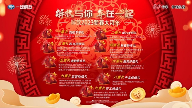 “解放與你 年在一起!”九重大禮將新年氛圍感拉滿,涵蓋購車、用車、養(yǎng)車各個環(huán)節(jié),優(yōu)惠、紅包及各種新春禮包等你來拿,無論你走到哪里,都能夠感受到來自解放的溫暖。