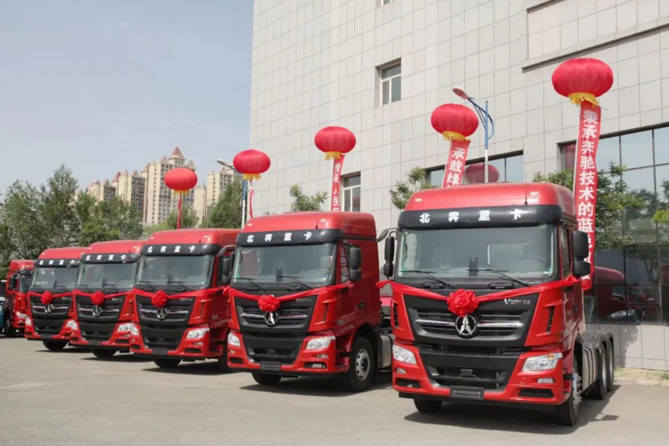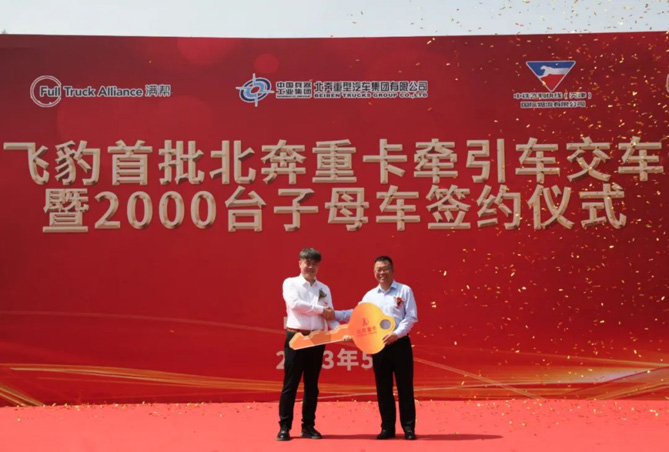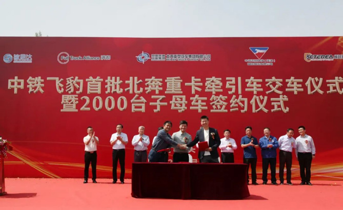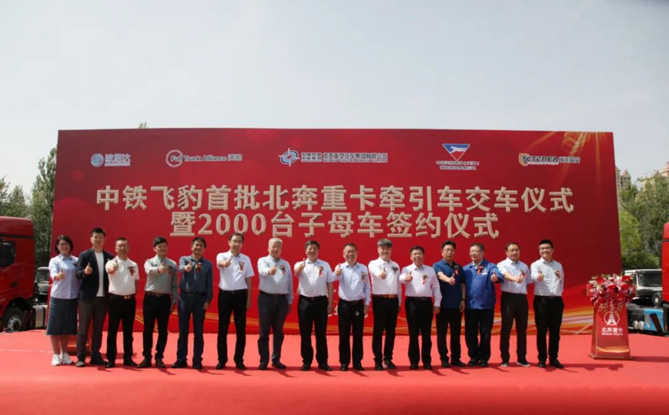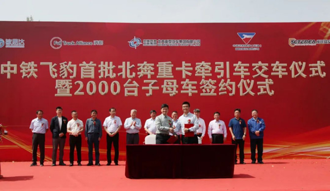 北奔重汽與中鐵飛豹快線(天津)國際物流有限公司簽訂了2000臺子母車采購協議,與中鐵飛豹所托(珠海)智慧物流科技有限公司簽訂戰略合作協議
