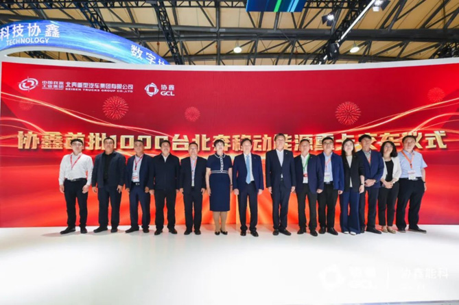 今年4月北奔重汽與協鑫集團達成戰略合作協議后,雙方圍繞自治區“新能源項目”,積極推動包頭市新能源項目指標落地,并于5月24日下午,在SNEC第十六屆(2023)國際太陽能光伏與智慧能源(上海)大會暨展覽會現場舉行了協鑫首批1000臺北奔移動能源重卡交車儀式。