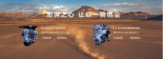 敢探者提供2.3T FEU汽油發(fā)動機(jī)和第五代2.3T PUMA柴油發(fā)動機(jī)兩種動力選擇,汽油發(fā)動機(jī)峰值功扭190千瓦/450牛米,柴油發(fā)動機(jī)峰值功扭130千瓦/450牛米,動力性能強(qiáng)勁。