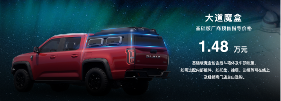 在本屆成都車展,大道魔盒也正式開啟預(yù)售,并將在10月起陸續(xù)交付,敢探者、追光者均可選配。魔盒基礎(chǔ)版廠家預(yù)售指導(dǎo)價格為1.48萬元(包含后斗箱體及車頂帳篷,如需選配內(nèi)部組件,如托盤、抽屜、邊柜等可在線上及經(jīng)銷商門店自由選購)。
