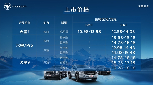 雪域盛開格桑花,火星皮卡世界之巔三箭齊發。為持續推動福田皮卡業務乘用化轉型升級及持續增長,火星皮卡進一步完善產品矩陣,攜火星9汽油版、火星7Pro柴汽油版、火星7柴油啟航版三款產品在世界之巔珠峰正式上市。火星9汽油版價格14.78萬-18.18萬,火星7Pro汽油版價格12.98萬-15.48萬,此次上市的火星皮卡汽油版車型不僅匹配245馬力+采埃孚8AT澎湃動力,全系更標配多連桿后懸+電動助力轉向,瞄準乘用市場以乘用化和高端化加速市場高品質增長;同時火星7Pro柴油版價格13.68-16.18萬,動力仍采用行業首創柴油混動系統,綜合扭矩達450牛米,全系標配多連桿后懸,駕乘體驗再升級。