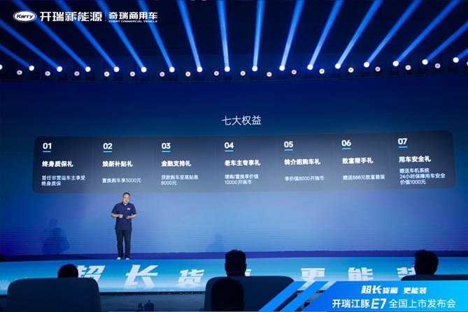 在價格和用戶權益方面,開瑞汽車也是誠意滿滿。開瑞新能源控股有限公司國內銷售公司執行副總經理、面車營銷公司總經理唐斌現場公布了開瑞江豚E7的上市車型及售價:“創業版”41.86kwh 開瑞電池,售價11.58萬元起;“致富版”50.38kwh 開瑞電池,售價12.28萬元起,凡在5月31日前購車的用戶,贈送價值20000元的7重大禮: