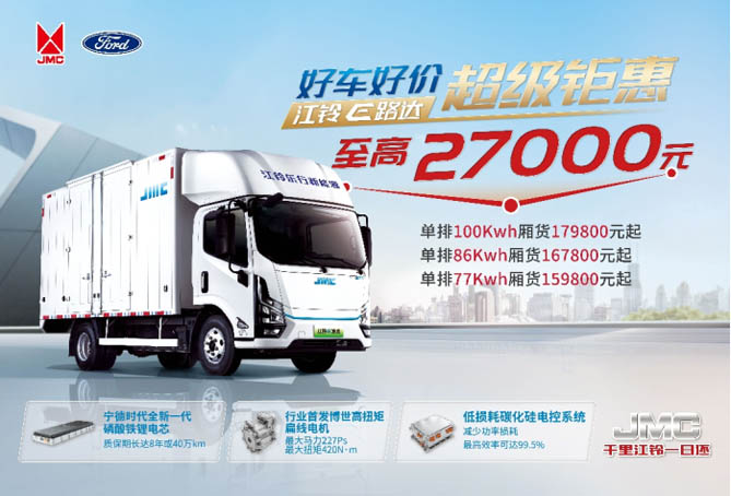 以好價,買好車;用車省,購車更省,江鈴E路達還進一步推出超級鉅惠活動,購車門檻大幅降低,驚喜一步到位!單排廂貨15.98萬起,至高優惠27000元!E路達純電版以其超長的續航和強勁的動力等優秀品質獲得了越來越多卡友的青睞。