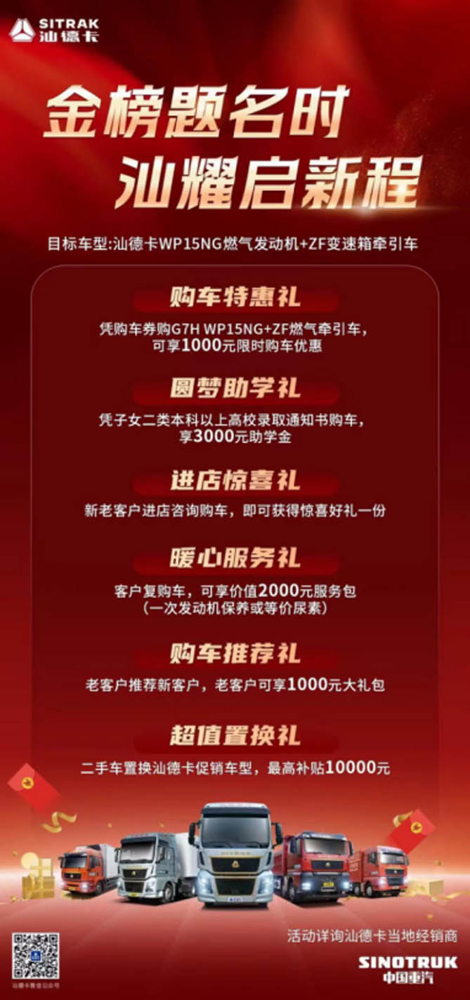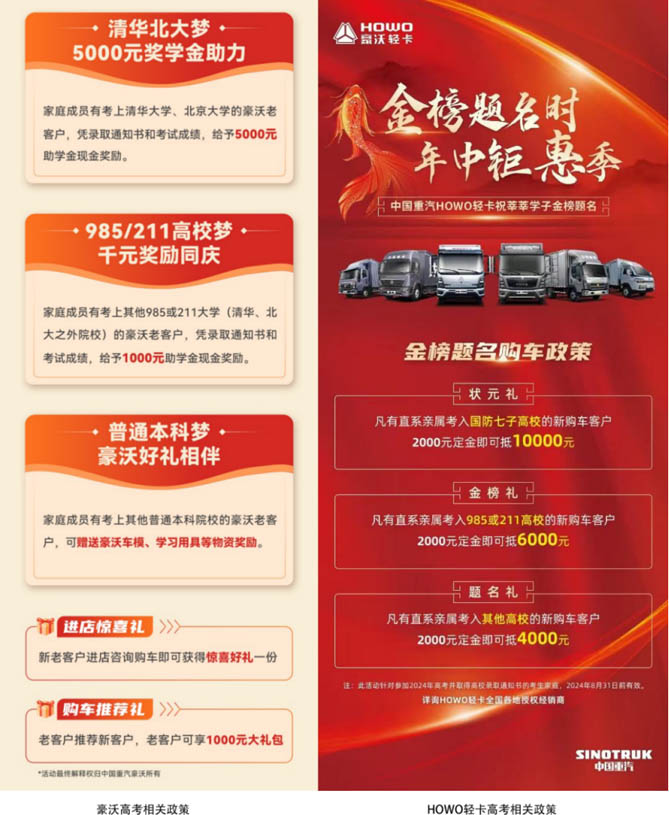 中國重汽豪沃重卡和HOWO輕卡也深情獻禮。豪沃重卡方面,推出“清華北大夢”“985/211夢”“普通本科院校夢”助學禮遇,對被錄取的客戶子女將分別給予5000、1000及車模等獎勵。HOWO輕卡則為考生提供狀元禮、金榜禮、題名禮等助學好禮——第一重狀元禮:凡有直系親屬考入國防七子高校的新購車客戶,2000元定金即可享受10000元的購車抵扣;第二重金榜禮:凡有直系親屬考入985或211高校的新購車客戶,2000元定金即可享受6000元的購車抵扣;第三重題名禮:凡有直系親屬考入其他高校的新購車客戶,2000元定金即可享受4000元的購車抵扣。以禮之名,更見深情,這不僅是對學子們學業成就的肯定,更是中國重汽對家庭和社會責任的深深致敬。