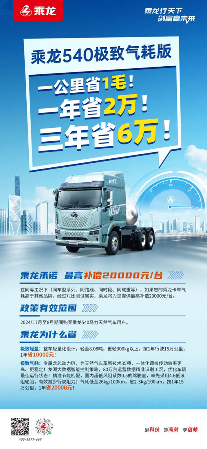 2024年7月至8月期間,購買乘龍540極致氣耗版牽引車的用戶,如果您的乘龍卡車在同等工況下(同車型系列、同路線、同時段、同載重等)氣耗高于其他品牌,經過對比測試屬實,乘龍將為您提供最高補償20000元/臺。