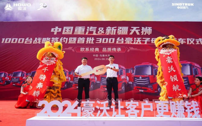 活動現場,豪沃重卡與新疆天獅的1000輛戰略簽約儀式與300輛豪沃子母車的榮耀交付共同鑄就了慶典的輝煌時刻。金鑰匙的傳遞,不僅是車輛所有權的交接,更是雙方信任與合作的象征。在豪沃高端高效產品的加持下,新疆天獅將進一步提升煤炭運輸效率,降低運營成本,為新疆乃至全國的能源供應貢獻力量。