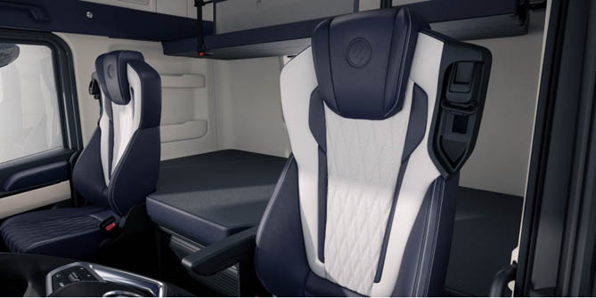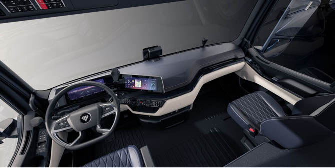 歐曼銀河家族成員,每一款都有自己的專屬造型之美,并實現將美學與工程相結合,構建起全新的重卡實用美學主義。歐曼銀河7在外觀上采用直瀑式格柵,這也是全球首款采用直瀑式格柵的量產商用車。同時,整車姿態略微后仰,具有流線感的同時還十分穩重,前圍到側圍采用大圓角過渡,除了帶來的視覺美感,還能帶來超高、超快的進風效果。同時繁簡相宜的科技幾何大燈,功耗低,且配置自動轉向輔助照明功能,讓行車更加安全,使用更人性化。