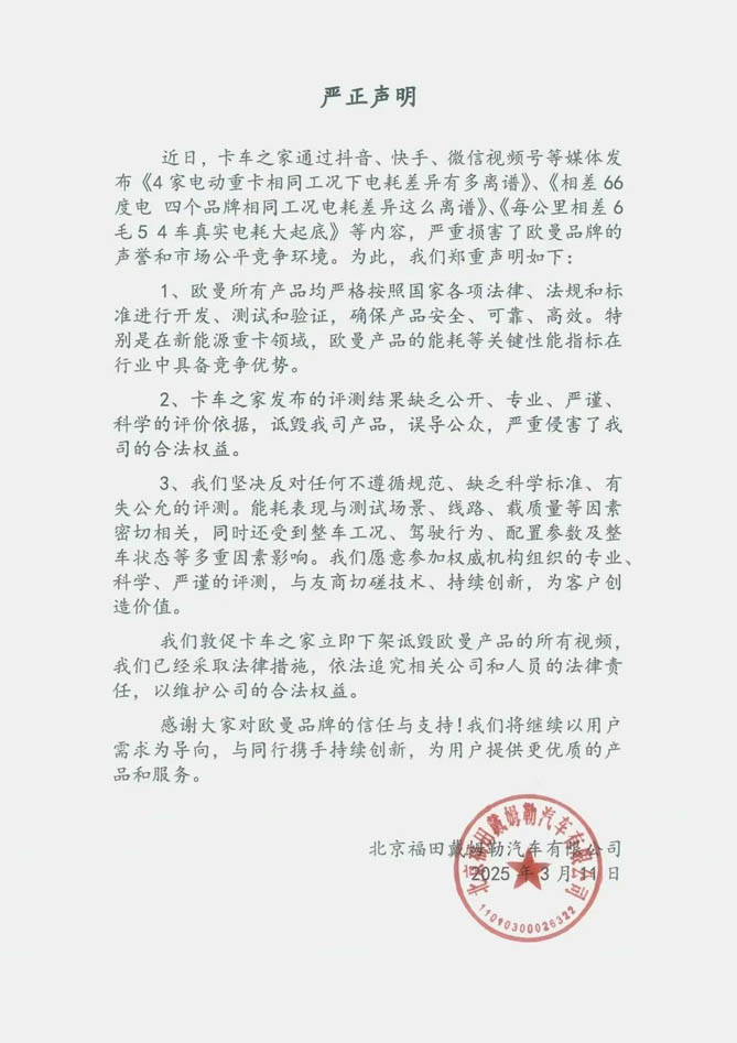 北京福田戴姆勒汽車有限公司對卡車之家發布的關于歐曼產品的部分內容進行嚴正聲明。