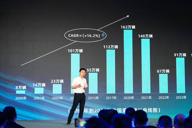 會議現(xiàn)場,零一汽車創(chuàng)始人、COO張偉向客戶、經(jīng)銷商及合作伙伴描述了新能源重卡市場的巨大機遇。他指出,自2017年國務院發(fā)布《促進汽車動力電池產(chǎn)業(yè)發(fā)展行動方案》以來,新能源重卡行業(yè)便迎來爆發(fā)式增長。2024年,新能源重卡銷量從2021年的1萬輛躍升至8.2萬輛,凈增長達7.2萬輛。2025年,新能源重卡開局良好,全年有望達到14萬輛規(guī)模,滲透率進一步升至20%。到2030年,新能源重卡滲透率有望達到50%,年銷量達40萬輛。