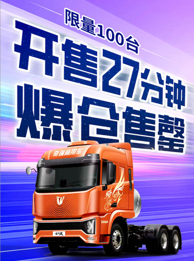 2025年5月28日,奇瑞商用車以一場火爆的線上搶購活動,再次證明了其產品在市場中的強勁號召力。在備受矚目的奇瑞商用車戰略級新品金鳳凰燃氣重卡正式面向市場之際,同步開啟的線上搶購通道,僅用時短短90分鐘,首批100臺新車便宣告售罄。這一驚人的“奇瑞速度”,不僅是用戶對產品價值高度認可的直接體現,更彰顯了奇瑞商用車“定義重卡價值新標準”的強大市場底氣。