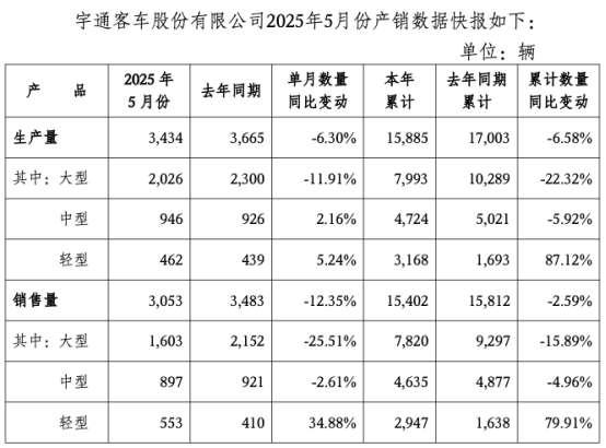 具體來看,2025年5月份,宇通大型客車銷量為1603輛,中型客車銷量為897輛,輕型客車銷量為553輛(同比增長34.88%);1-5月份,宇通大型客車?yán)塾?jì)銷量為7820輛,中型客車?yán)塾?jì)銷量為4635輛,輕型客車?yán)塾?jì)銷量為2947輛(同比增長79.91%)。