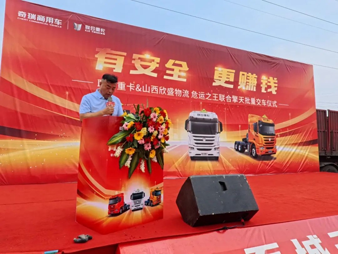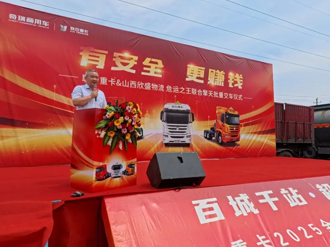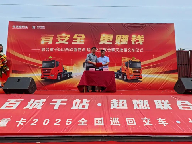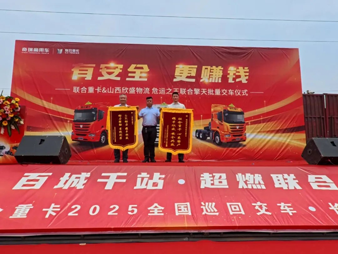 2025年6月20日,“百城千站 超燃聯合”聯合重卡2025全國巡回交車長治站順利舉行,技術奇瑞賦能下的聯合重卡迎來了與山西欣盛物流關于危運之王聯合擎天的批量交車,同時雙方也進行了戰略簽約。此次產品的交付既是雙方深化合作的重要實踐,也是客戶對聯合重卡產品力的雙重認可,為當地危化品運輸轉型升級注入全新動能。