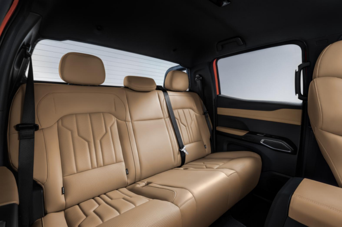 座椅系統的分塊設計堪稱人機工程學典范:前排坐墊采用高回彈材質,靠背側翼支撐角度經過成百上千次仿真測試,確保長途駕駛腰部受力均勻,即使連續駕駛數小時也不會感到腰酸背疼;后排26度黃金靠背角搭配494.2mm超長坐墊,讓兒童腿部全程舒適支撐、老人久坐也不會感到腿部酸脹麻木,對家庭出行十分友好!這種將乘用化體驗注入皮卡基因的設計,本質是對“車為人服務”理念的回歸。