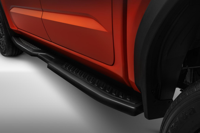 傳統皮卡車型的上下車踏板設計,往往在實用性和細節上有所欠缺:要么寬度不足導致踩空風險,裝卸貨時缺乏攀爬支點,只能踩輪胎或后保險杠,存在一定安全隱患。對比同級車型,威麟R08采用2206×168×100mm的加大側踏板,面積比同級車型有所提升,不僅成為車身美學的延伸,更化作前后排上車時穩健的“臺階”。