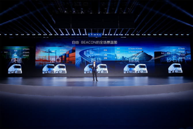 以福田卡文重卡BEACON為例,基于獨(dú)創(chuàng)的一體化平臺(tái),獨(dú)創(chuàng)跨平臺(tái)、可拓展、高集成的動(dòng)力底盤一體化架構(gòu),實(shí)現(xiàn)氫電共平臺(tái)與高集成承載。