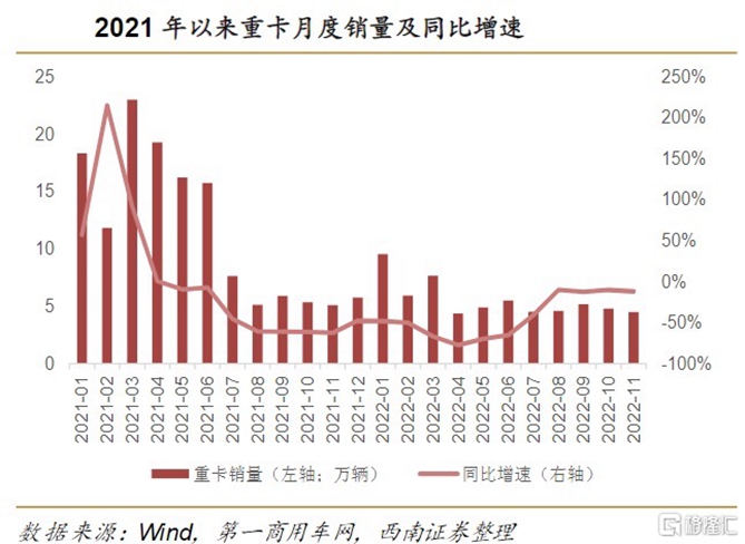 回到重卡行業(yè)周期來看,市場普遍認為2023年重卡行業(yè)將迎來復蘇。西南證券指出,自去年5月以來,重卡市場已遭遇“19連降”,重卡銷量跌至冰點。但8月以來同比降幅已經(jīng)縮窄至10%左右,呈現(xiàn)一定銷售回暖現(xiàn)象。最新11月數(shù)據(jù)顯示銷量4.5萬臺,同比降幅約12%,主要是受到廣州、重慶等地疫情影響。