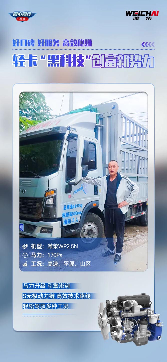 劉師傅不久前新?lián)Q的“坐騎”已突破四千公里里程,“新伙伴”濰柴WP2.5N一直發(fā)揮穩(wěn)定,表現(xiàn)優(yōu)秀。劉師傅說:“之前開車的時候,雖然短途,但是跑的地方多,油耗也較高,自從換了濰柴WP2.5N,油耗大幅度降低,較同級別動力要低1-1.5L/100km,省油同時也獲益。”