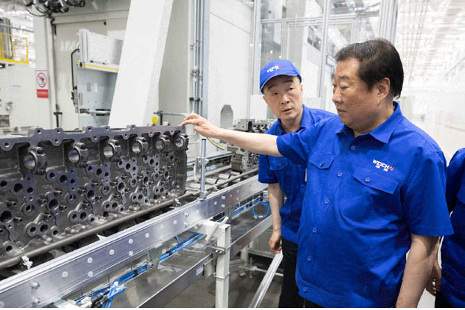 譚旭光調(diào)研了加工、裝試等生產(chǎn)線,并與員工共同見證濰柴高端發(fā)動機(jī)數(shù)字化工廠全線達(dá)產(chǎn)暨第15000臺產(chǎn)品下線。