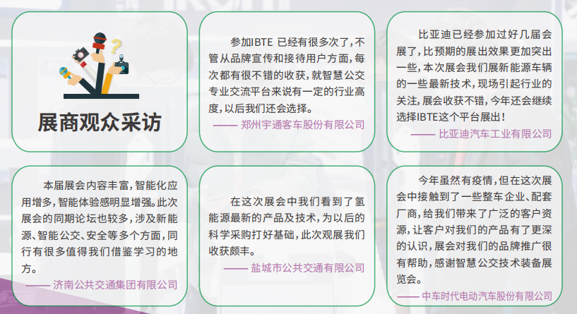 每年都參加這個(gè)展會(huì),在各種細(xì)節(jié)方面,都明顯地感覺到主辦方的用心。展會(huì)期間了解到了公交客車行業(yè)的最新發(fā)展動(dòng)向,同時(shí)也對(duì)例如氫燃料、輕量化、智能化等做了信息的收集,更為重要的是對(duì)以后客車業(yè)的發(fā)展有了更加清晰的判斷。 ——上海燃料電池汽車商業(yè)化促進(jìn)中心