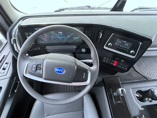 進入駕駛室,可以看到比亞迪Q3純電動牽引車的駕駛室采用了環繞式儀表臺,多功能方向盤抓握感非常貼合手掌,儀表盤采用了機械指針加8寸液晶顯示屏的設計,顯示信息簡潔明了,能讓駕駛員及時掌握車輛動態信息。而且,中控臺功能按鍵觸手可及,充分詮釋了“以駕駛者為中心”。另外,這款車還能選裝PAD系統,10.1英寸的高清大屏等多種功能。