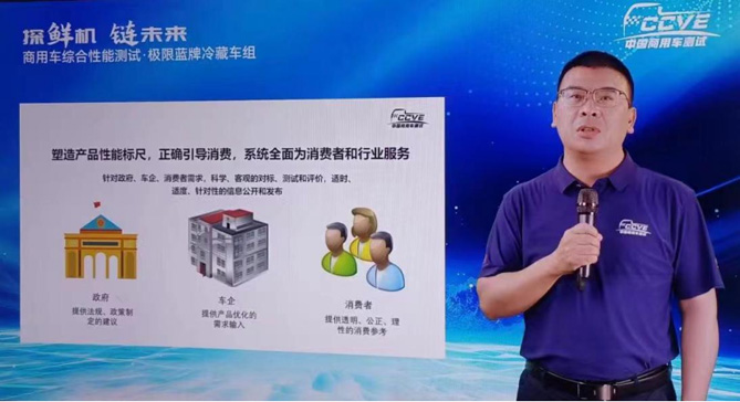 中國能源汽車傳播集團黨委副書記、副董事長、總經理,《中國汽車報》社社長辛寧介紹商用車綜合性能測試(極限藍牌冷藏車組)初衷