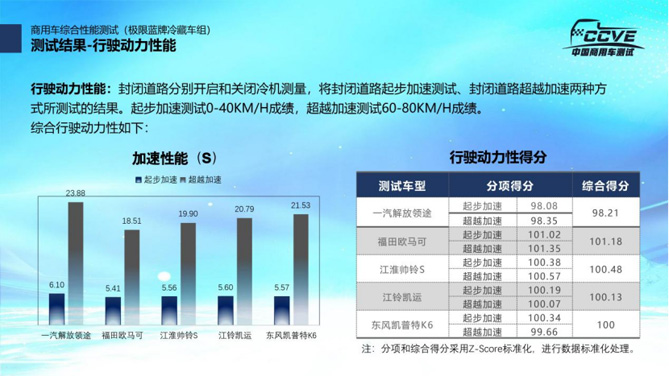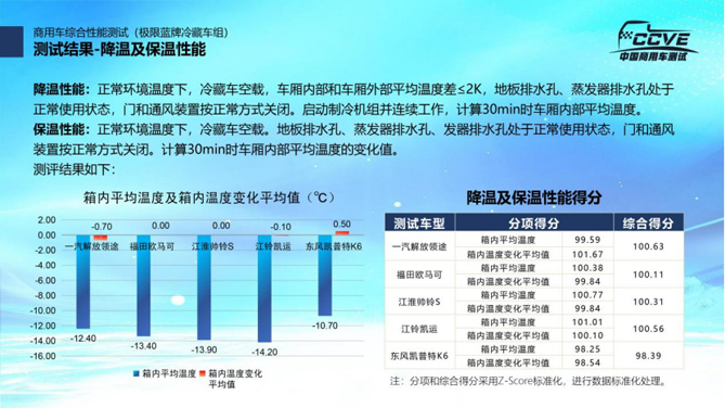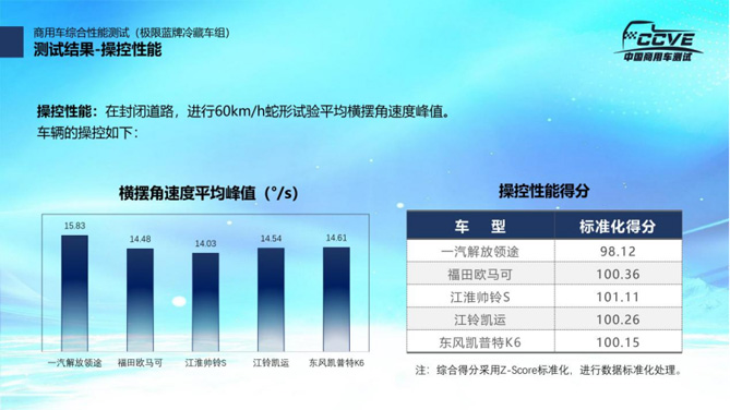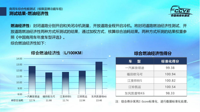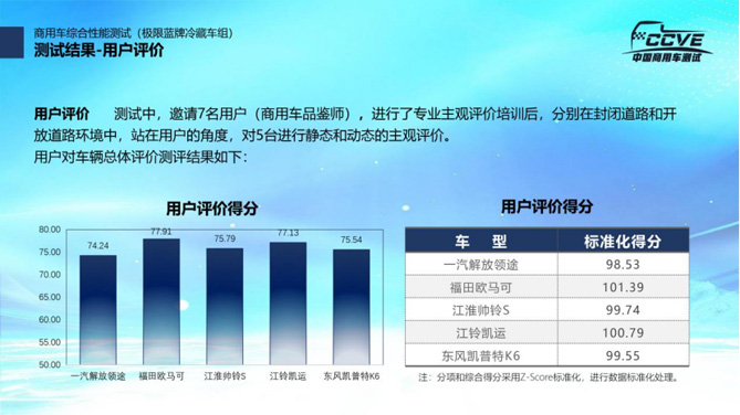 測試結束后,主辦方根據測試數據,按照燃油經濟性、駕乘舒適性、行駛動力性、制動性能、操控性能、降溫及保溫性能及用戶評價七個維度計算出五款車型的測試得分。陳志強介紹說,本次測試活動從前期策劃到測試全過程均立足于從消費者角度展開,各項指標結果,通過Z-score方式進行標準化處理,最終生成標準化得分,以便于物流用戶進行參考。
