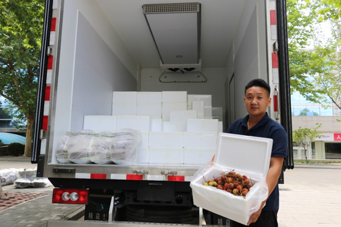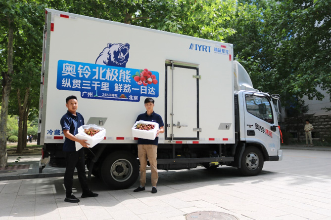 一天前,這批南方盛產(chǎn)的水果,還高掛在廣州從化的荔枝樹上。現(xiàn)場采摘之后,經(jīng)過預冷處理,兩位司機師傅將這批荔枝裝入已調整好冷機溫度的奧鈴北極熊冷藏車上,車輪不停,從廣州從化、經(jīng)湖北武漢、到河南鄭州、入河北,歷經(jīng)3000公里,最后到達北京福田奧鈴總部。