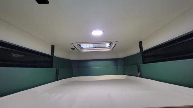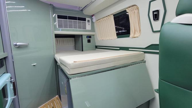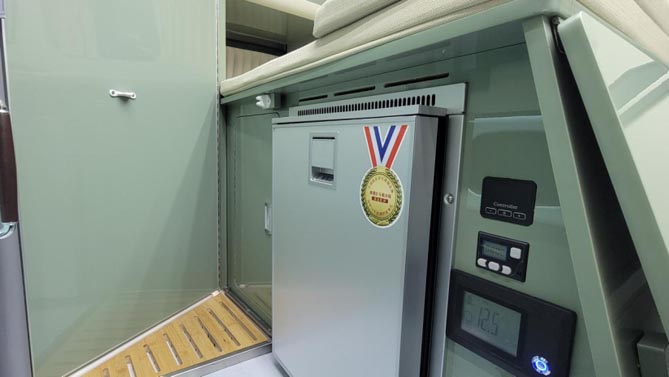 在不升頂的情況下,下方的一張縱置床也可以滿足單人的睡眠,通過座椅的前移可延展達到1850mm*850mm;床尾上方安裝了KME的房車變頻空調,床下位置裝有房車專用冰箱,床板下多余的空間就是整車的一個獨立儲物區域。