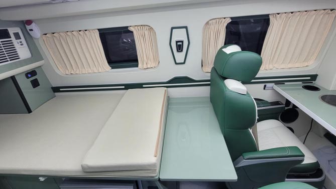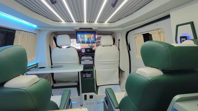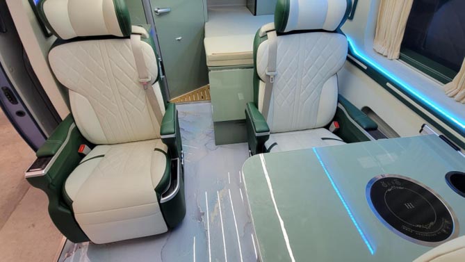 齊星星領的商務座椅可實現四向調節,帶有按摩、加熱、通風功能,長途旅行舒適性更高,可拆卸式的小桌臺上面置有800W的電磁爐,日常車內可進行輕油煙的簡餐烹飪。