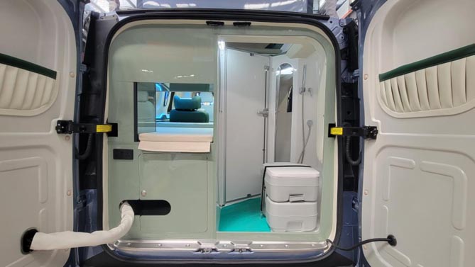 緊挨縱置床的一側是固定式衛浴間,采用后開闊式設計,具備多功能使用,配備便攜式移動馬桶、淋浴花灑,整體可實現旅行應急如廁、洗漱,也可作一個單獨的儲物空間。