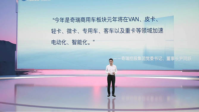 發布會中,奇瑞商用車研究院院長徐鵬先生登場致辭,全面介紹了開瑞品牌的戰略目標和方向。背靠“技術奇瑞”金字招牌,通過實施“1221”戰略、聚焦三電系統、模塊化架構、智能網聯等核心技術,布局商用車特殊領域瑤光實驗室,推動奇瑞商用車更加快速、穩健的發展。徐鵬院長還詳細講解了奇瑞商用車在技術方面的升級與優勢,未來將在VAN、皮卡、輕卡、微卡等多領域加速電動化、智能化,描繪了奇瑞商用車未來發展的新藍圖。