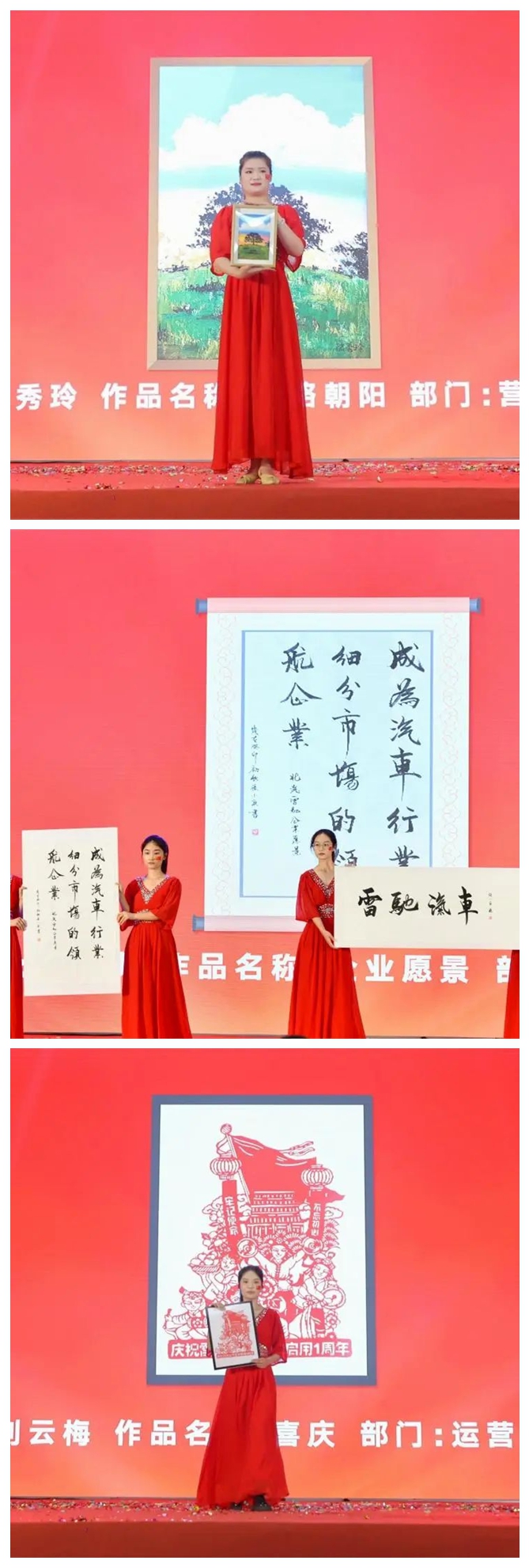 頒獎(jiǎng)儀式 為慶祝中華人民共和國(guó)成立74周年暨北汽雷馳新能源商用車總部基地啟用一周年,廣大員工紛紛通過(guò)書法、繪畫、剪紙、短視頻等多種方式祝福祖國(guó),祝愿北汽雷馳。