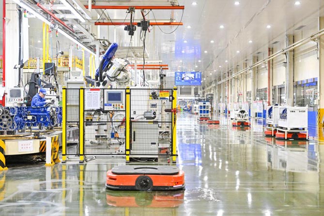 在濰柴清潔能源發動機生產制造基地,AGV智能運輸車忙碌地穿梭,它們就像機器人一樣,能夠根據產線需求準確地將零部件放置在托盤上,并通過二維碼進行精準定位,把零部件送到不同的生產線位置。與此同時,高精尖數控加工中心也在不停運轉,進行切削、鉆孔、自動上下料等操作。放眼望去,整個加工生產線上幾乎看不到人工操作,自動化程度相當高。