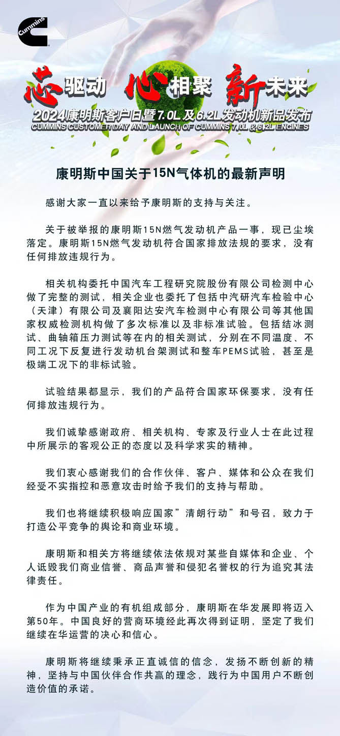 關于被舉報的康明斯15N燃氣發動機產品一事,在客戶日上,康明斯中國也作出了回應和澄清: