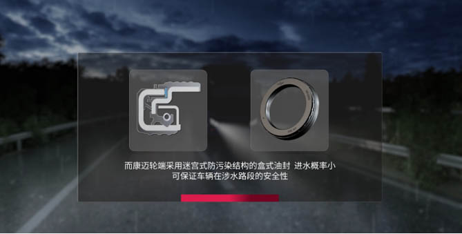 使用油潤滑技術的康邁輪端,采用的是盒式油封,與傳統(tǒng)油封相比,擁有復雜的迷宮式防塵設計和更強壯的骨架,并有專門的防泥水設計輔助,進水概率小,可保證車輛在涉水路段的行駛安全性,幫卡友省力、省時、多賺。