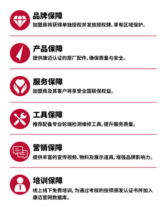 康邁誠摯邀請志同道合的行業伙伴加盟,共同深耕商用車后市場,實現價值共贏??颠~將為加盟商提供全方位的支持,包括門店形象設計、盈利項目擴充、零配件供應、商業價值挖掘以及技術指導培訓。