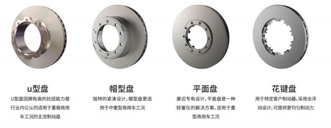 輪端、制動盤連接處優化設計,符合康邁有限元分析要求,歷經嚴格的康邁疲勞強度等試驗驗證,抗扭能力強、市場應用斷裂風險小。目前,康邁可為用戶提供u型盤、帽型盤、平面盤、花鍵盤這四類制動盤,適用于不同的中重型商用車工況。