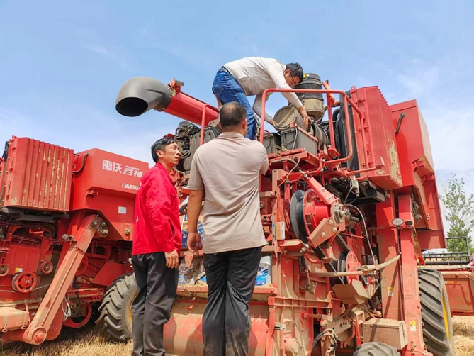 四臺收割機并排停在地里,趁蘇師傅和農戶談價錢的間隙,劉振江爬上爬下為四臺收割機做檢查。他發現其中一臺收割機有一根機油管表皮出現了皸裂,但還沒有到必須更換的程度。“以防萬一,我們要未雨綢繆。”劉振江認為,濰柴服務夏收保障突擊隊的意義不僅在于解決用戶已出現的問題,更要提前發現排除隱患。