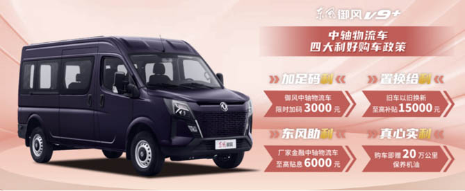 2024年9月1日至10月31日,購買東風(fēng)御風(fēng)V9+中軸物流車可享受3000元補貼及20萬公里保養(yǎng)機油,以舊換新可享國補,至高可達15000元,廠家金融貼息至高6000元,好車好價,給“利”來襲,正是廣大車友入手的絕佳時機。詳情可咨詢當?shù)亟?jīng)銷商,東風(fēng)御風(fēng)V9+ 為美好生活提速!