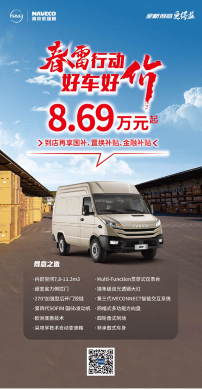 豆包告訴老周,南京依維柯“春雷行動”中,用戶購車可享受現(xiàn)金補貼、金融貼息、保險優(yōu)惠以及至高20000元的國補,老周心儀的得意單胎車型只要8.69萬元起!看見如此親民的價格,老周不禁喜上眉梢!