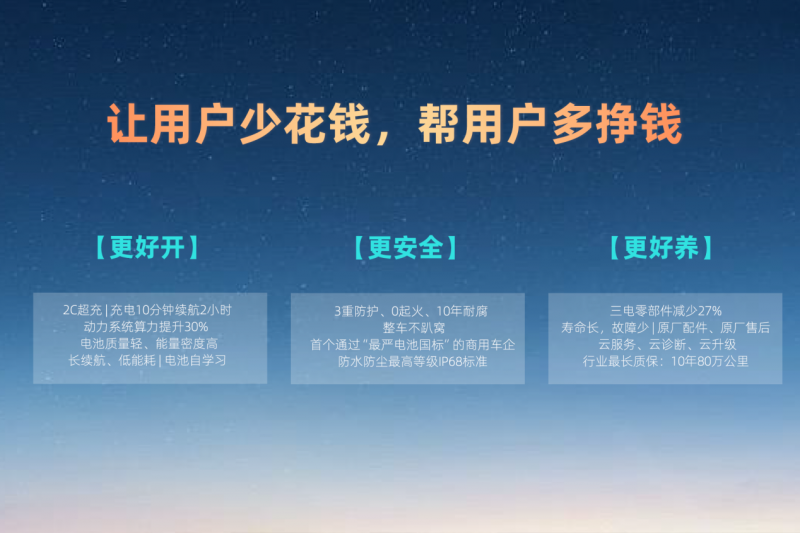 在新能源商用車領域,所有技術創新的最終落點是用戶體驗,創造真實價值。搭載玄武動力的全新遠程星享V7E,其核心價值直指用戶需求,以“高效運營、安全可靠、省心養護”三大核心優勢兌現“讓用戶少花錢、多掙錢”的承諾。