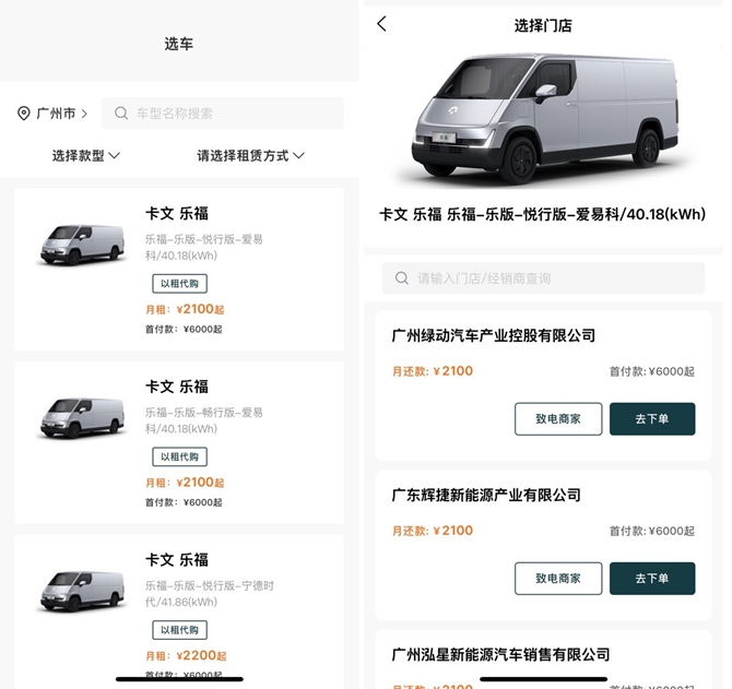 卡文e家支持選擇城市、車型、租賃方式(經營性租賃和以租代售),為用戶推薦車型、租賃方案及附件門店,讓客戶快速下單。租賃方案可定制,可租可售多種方案選擇,降低購車門檻,增加收入來源。