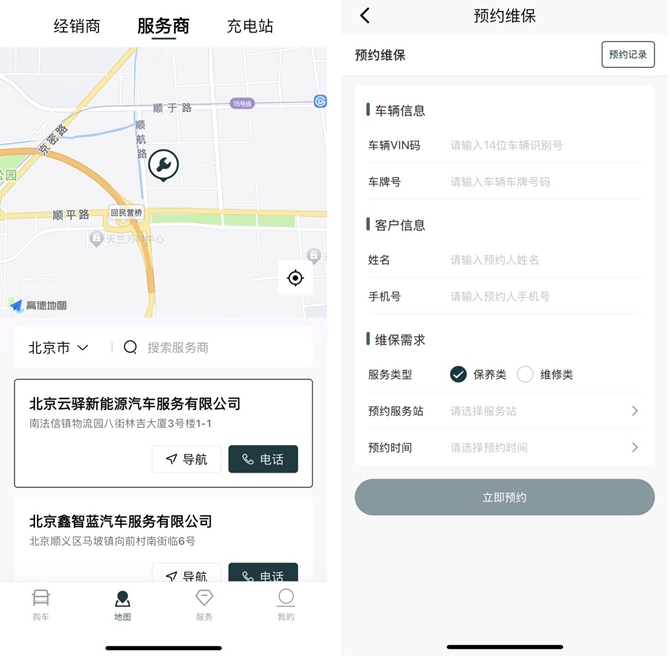 進店維保,可以通過地圖查詢附近的服務站,選擇您心儀的門店一鍵導航進行維保。在線預約維保,用戶只需輕點屏幕,即可一鍵預約,服務商可提前準備材料,協調維修工位,讓客戶享受透明高效的養車體驗。此外,道路救援、24小時400客服、用戶維保手冊等功能,也寸步不離地為車主提供著全方位的用車保障。