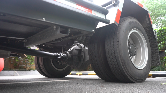 該車型的最大亮點在于其“可下地庫”與“雙胎”設計。憑借僅2100mm的外部高度,它可以輕松進入絕大多數標準限高的地下停車場,解決了裝修垃圾清運“最后一公里”的難題。動力上,搭載云內160馬力發動機與最大27.64kW·h電池,配合帶爬坡檔的6檔自動變速箱,確保在純電模式下安靜進出小區,在混動模式下又能輕松應對滿載爬坡。3360mm短軸距保證了靈活性,而1093鑄造橋(6.833速比)和高強度車架提供了強大的承載基礎,使其成為名副其實的地庫清運多能手。